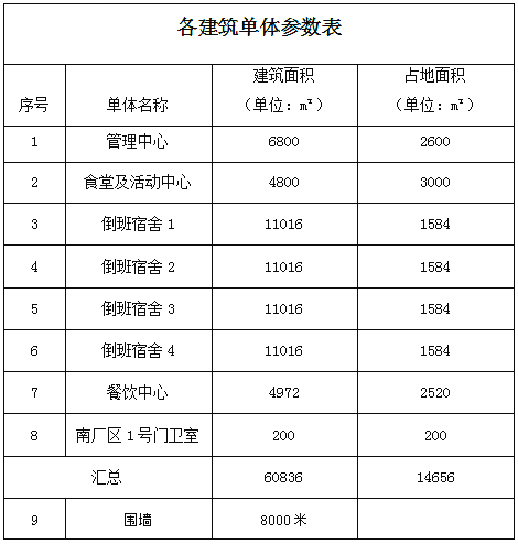 採購項目内容包括:管理中心、食堂及活動中心、倒班宿舍(暫定四棟)、餐飲中心、南廠區門衛室、圍牆立面概念設計,各單體參數如下表:
