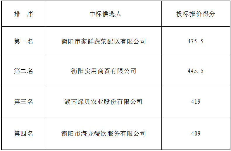 衡陽市衡府賓館有限公司(養正園)食堂食材(蔬菜類)於2021年1月27日上午9時00分(北京時間)進行瞭比選開标、評标活動,評标小組按照招标公告規定的評标辦法及原則進行評定,確定中标候選人如下: