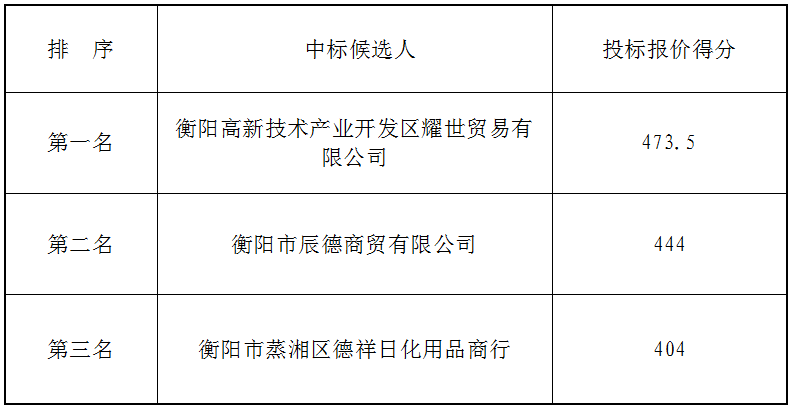 衡陽市衡府賓館有限公司(養正園)賓館客房用品(水果、副食類)於2021年1月27日下午2時30分(北京時間)進行瞭比選開标、評标活動,評标小組按照招标公告規定的評标辦法及原則進行評定,確定中标候選人如下: