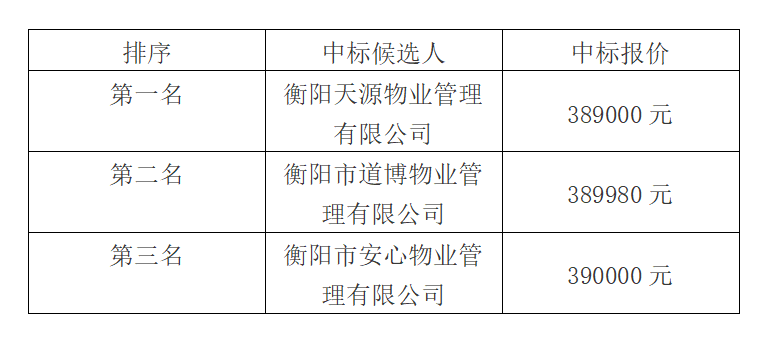 根據招标投标相關法律法規及招标文件的規定,衡拖棚戶區改造(一期)安置小區前期物業管理公司比選於2021年11月4日在弘湘寫字樓4樓會議室舉行開标、評标會,本項目採用“低價中标法”,現将中标候選人名單公示如下 :