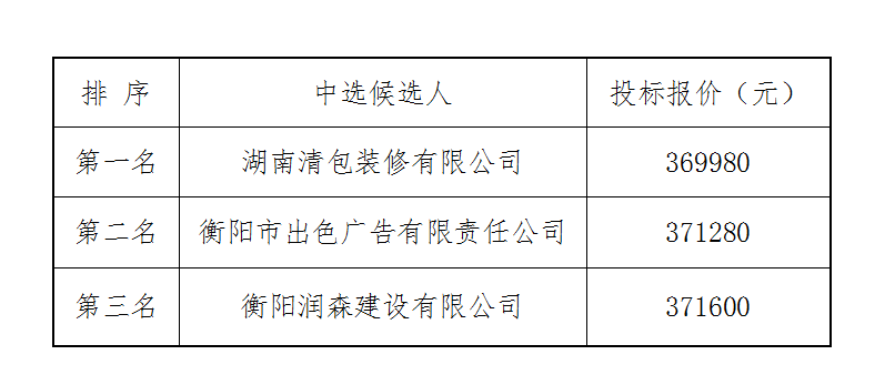 衡拖棚改(一期)掃尾零星工程施工單位比選於2022年7月1日上午9時00分(北京時間)進行瞭比選開标、評标活動,評标委員會按照比選文件規定的評标辦法及原則進行評定,推薦中選候選人排名如下:
