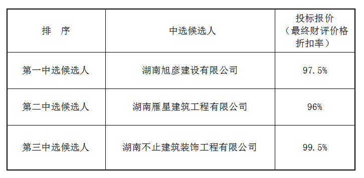 根據直接發包比選文件的規定,衡陽市高新區弘湘雙創智造基地(眼鏡小鎮)-标準廠房A3區綜合樓二次裝修施工項目於2022年11月14日舉行開标、評标會,本項目採用“綜合評标法”,經評标委員會評審現将中選結果公示如下 :