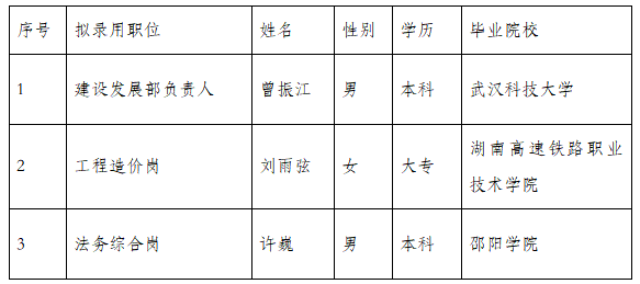 根據衡陽視界科技發展有限公司招聘工作方案安排,在集團公司的監督指導下,經公開面試,拟錄用曾振江等3人爲衡陽視界科技發展有限公司員工,現予以公示。公示期間如有異議,請向衡陽弘湘國有投資(控股)集團有限公司紀檢監察辦公室反映。