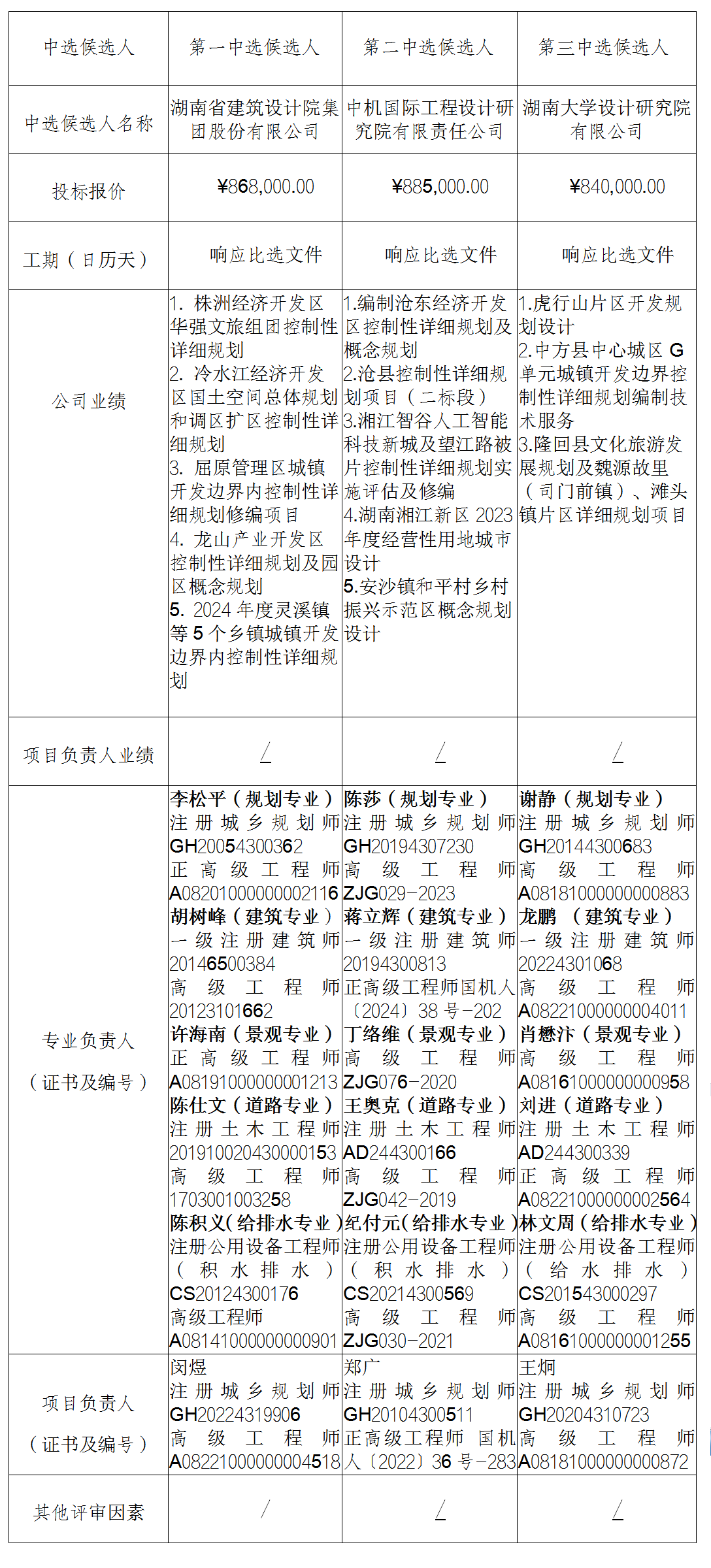 衡陽八中-植物園産教融合示範區城市設計(含概念性規劃)編制單位公開比選於2025年06月06日15:00在衡陽國投4棟3樓評标室進行瞭比選開标、評标活動,評标委員會按照比選文件及相關法律法規規定進行評審,推薦以下三名中選候選人(排序),現将相關信息予以公示。