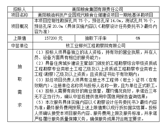 衡陽糧油科技産業園現代糧食倉儲建設項目一期地基詳勘項目於2025年7月1日在衡陽國投4棟3樓評标室進行瞭随機抽取,現将相關信息予以公示。