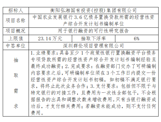 中國農業發展銀行3.6億債務置換貸款所需的經營性資産綜合開發計劃書編制單位於2025年7月9日在衡陽國投4棟3樓評标室進行瞭随機抽取,現将相關信息予以公示。