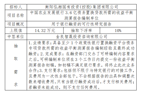 中國農業發展銀行3.6億債務置換貸款所需的收益平衡測算報告編制單位於2025年7月9日在衡陽國投4棟3樓評标室進行瞭随機抽取,現将相關信息予以公示。
