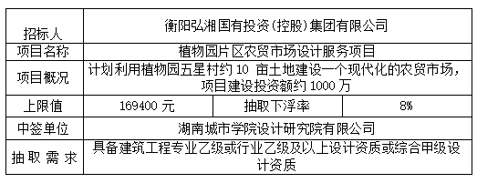植物園片區農貿市場設計服務項目於2025年8月1日在衡陽國投4棟3樓評标室進行瞭随機抽取,現将相關信息予以公示。
