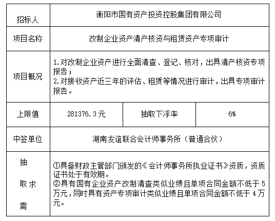 改制企業資産清産核資與租賃資産專項審計於2025年10月17日在衡陽國投4棟3樓評标室進行瞭随機抽取,現将相關信息予以公示。