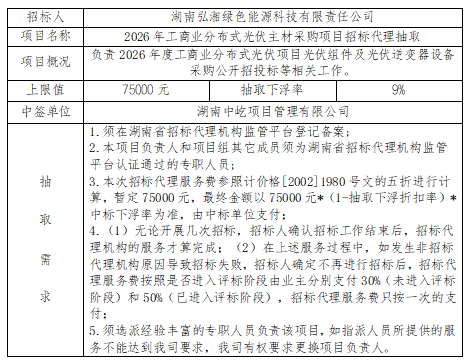 2026年工商業分布式光伏主材採購項目招标代理抽取結果公示