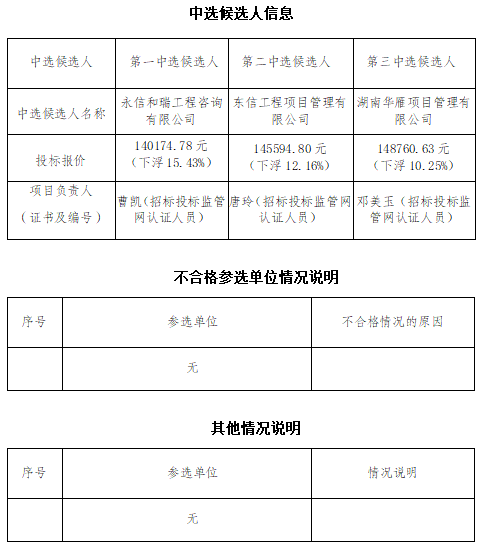 衡陽(國際)眼鏡小鎮人才公寓暨保障性租賃住房項目(二期)招标代理於2026年1月30日15:00在衡陽國投4棟3樓評标室進行瞭比選開标、評标活動,評标委員會按照比選文件及相關法律法規規定進行評審 ,推薦以下三名中選候選人(排序),現将相關信息予以公示 。