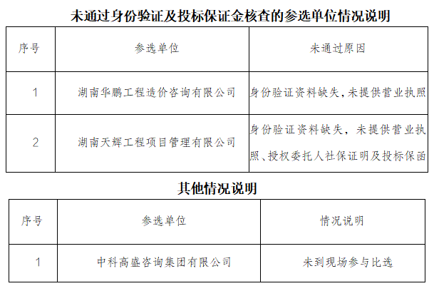 衡陽(國際)眼鏡小鎮首開區示範标準廠房(A地塊)新建EPC項目造價咨詢審核(複審)服務單位於2026年3月5日在衡陽國投4棟3樓評标室進行瞭比選,由於通過身份驗證及投标保證金核查後成功遞交參選文件的單位少於3家,不滿足開标條件,此次比選流标,具體情況公示如下 :