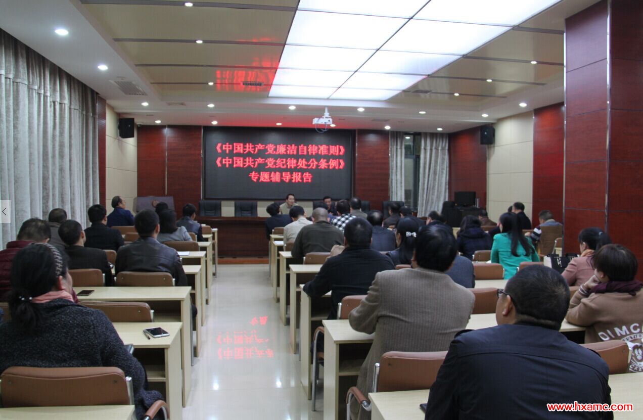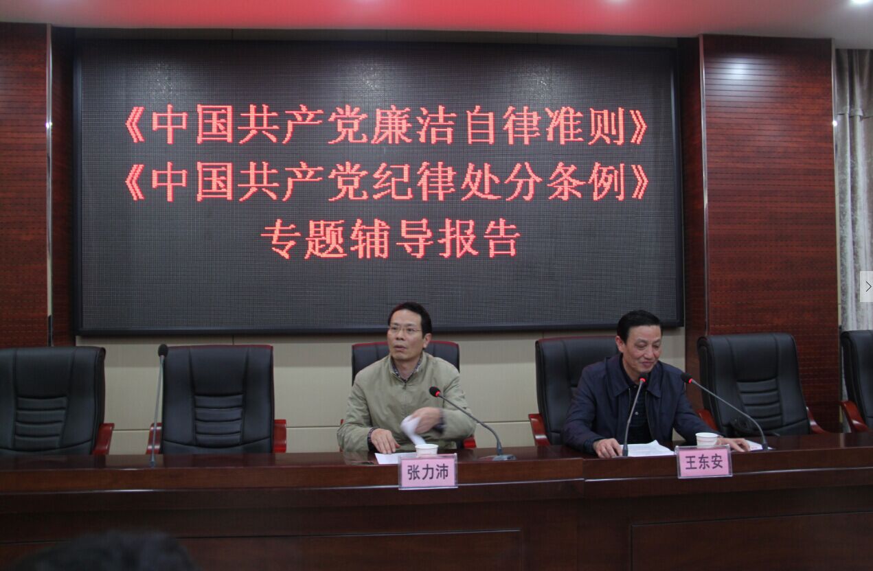 11月17日下午,弘湘公司組織全體幹部職工、子公司班子成員及參(控)股公司主要負責人學習貫徹新修訂的《中國共産黨廉潔自律準則》和《中國共産黨紀律處分條例》(以下簡稱《準則》和《條例》)報(bào)告會。市紀委正處級紀檢監察員、市監察局副局長王東安做專題輔導,弘湘公司黨組書記、董事長張力沛主持報(bào)告會並(bìng)作講話。